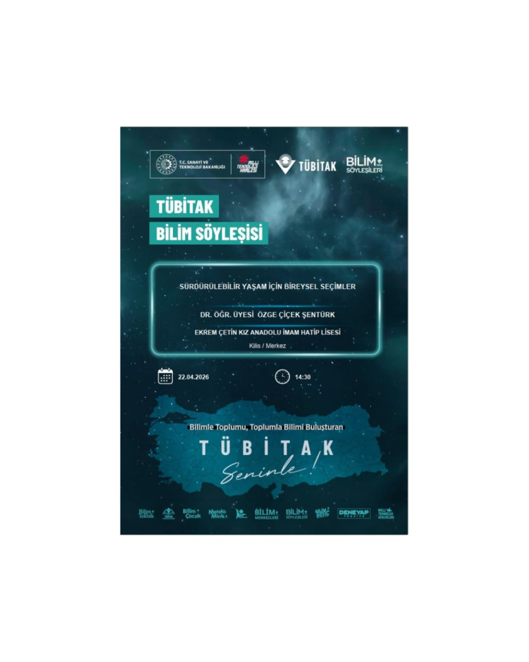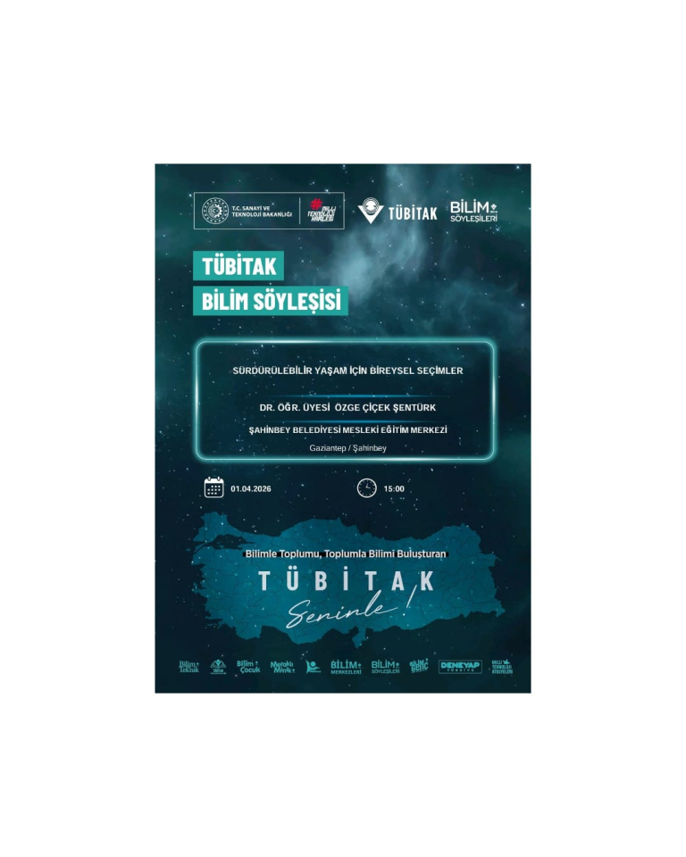 Koordinatör Yardımcımız Dr. Öğr. Üyesi Özge ÇİÇEK ŞENTÜRK, TÜBİTAK Bilim Söyleşileri kapsamında “Sürdürülebilir Yaşam İçin Bireysel Seçimler” başlıklı söyleşisiyle öğrencilerle buluşacaktır. Söyleşide, günlük yaşamda yapılan bireysel tercihlerin çevre üzerindeki etkileri ele alınarak sürdürülebilir yaşam konusunda farkındalık oluşturulması hedeflenmektedir.